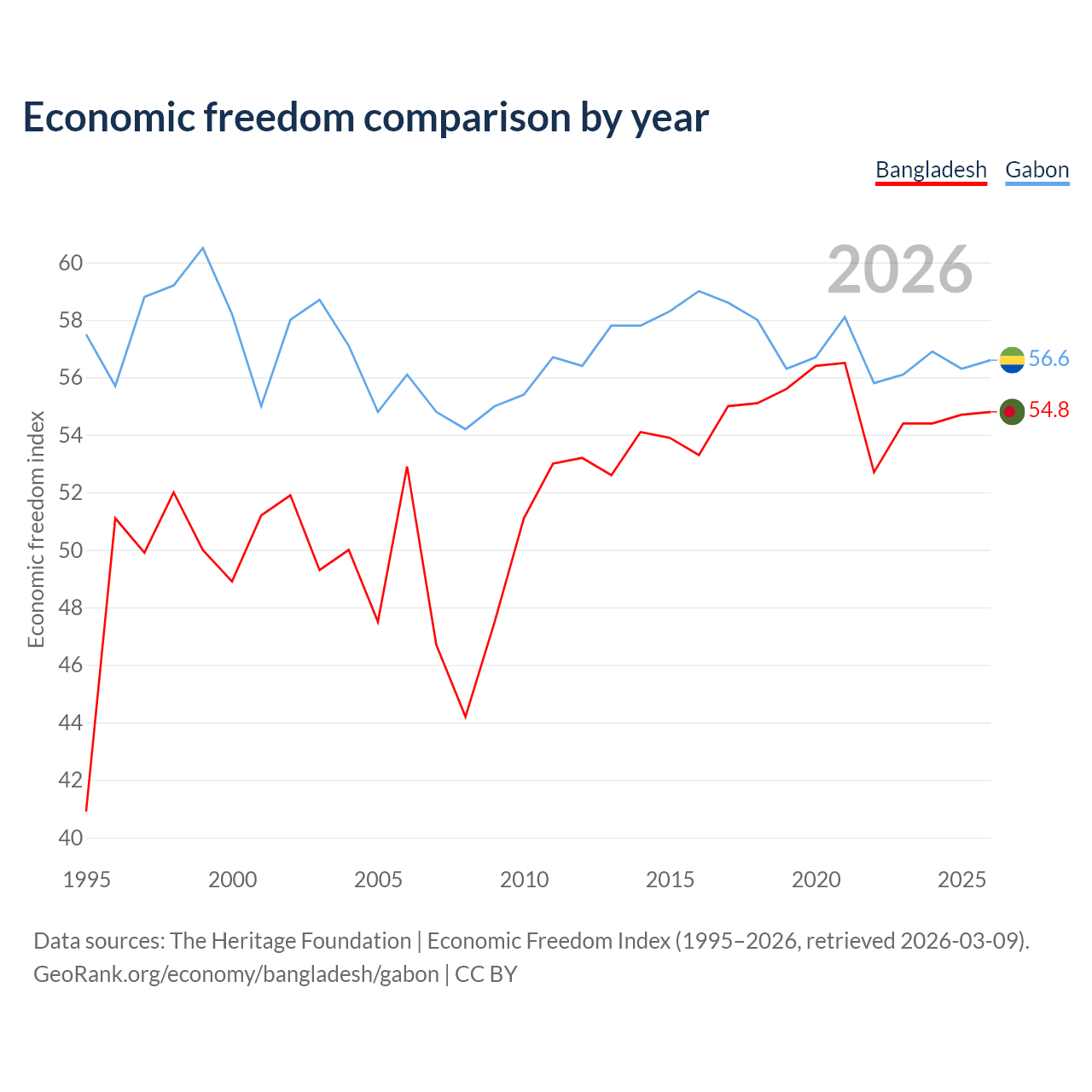 The Economic Freedom Index for Bangladesh is 54.8, ranking 131/197, compared to 56.6 for Gabon, ranking 120/197. The chart above displays a comparison of annual changes in economic freedom indexes.