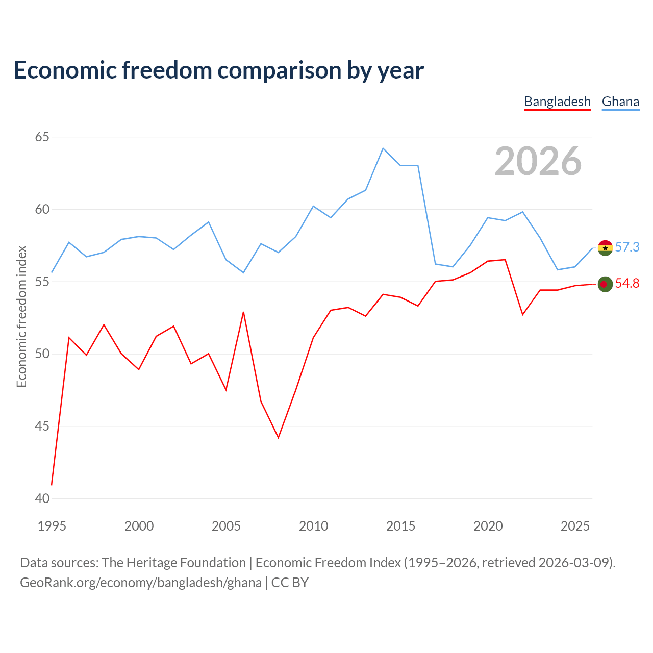 The Economic Freedom Index for Bangladesh is 54.8, ranking 131/197, compared to 57.3 for Ghana, ranking 118/197. The chart above displays a comparison of annual changes in economic freedom indexes.