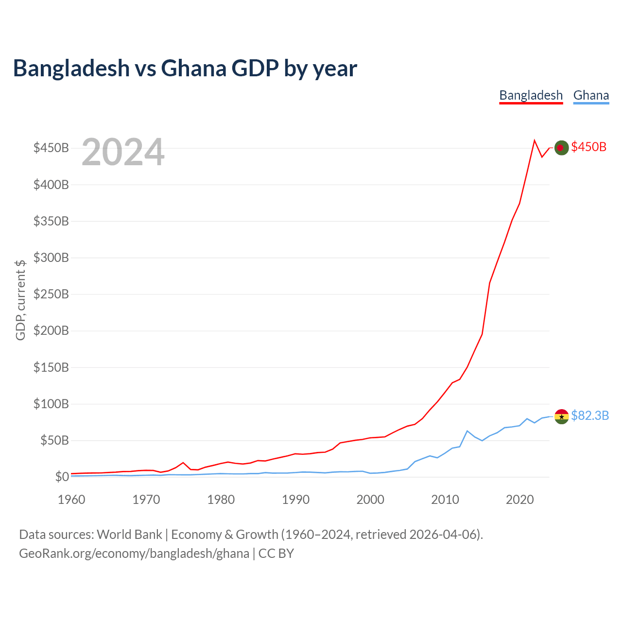 Bangladesh has a GDP of $450B compared to $82.3B for Ghana, ranking 36/197 and 80/197 by economy size, respectively.