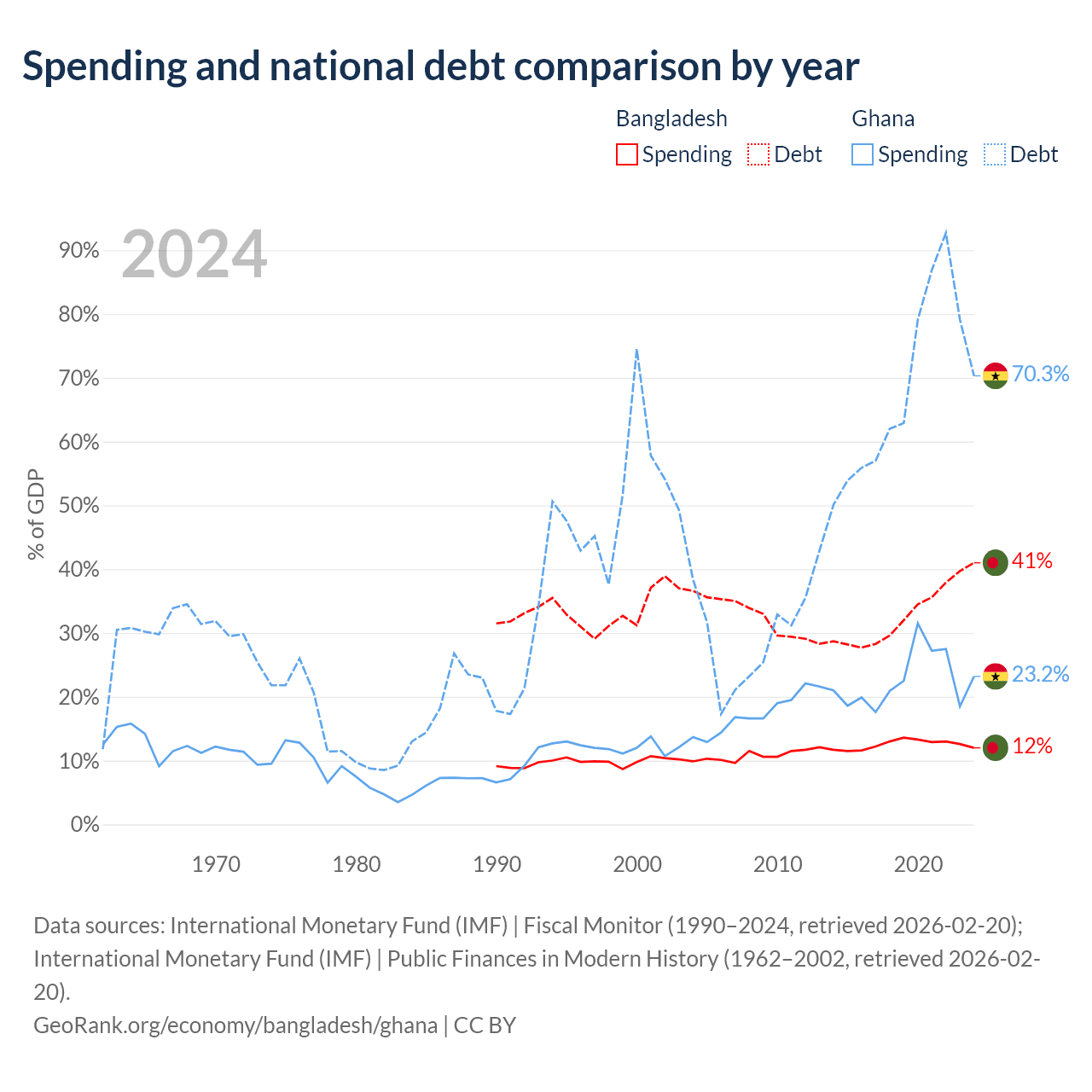Bangladesh has $184B in government debt (41% of GDP), compared to $57.9B (70.3% of GDP) in Ghana.