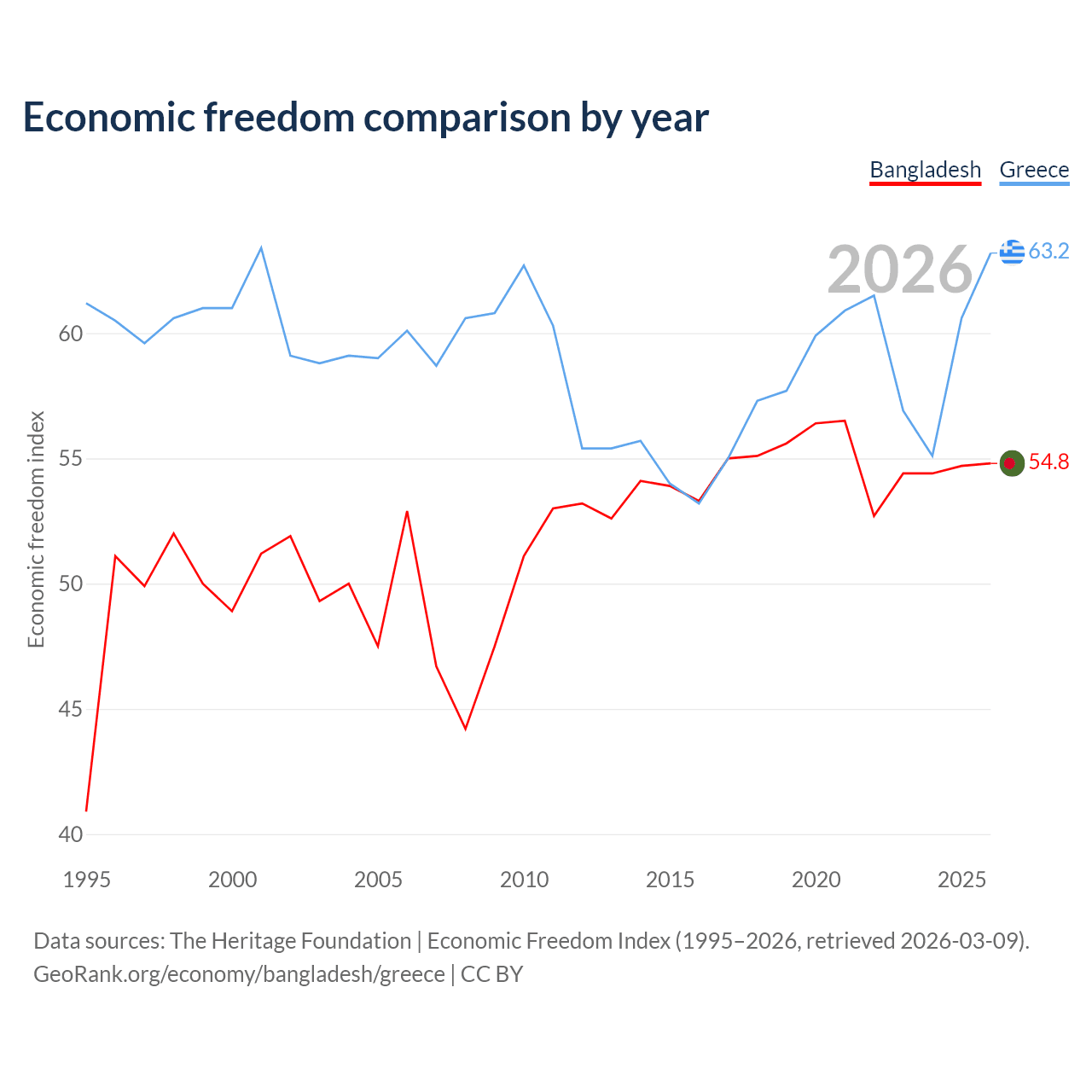 The Economic Freedom Index for Bangladesh is 54.8, ranking 131/197, compared to 63.2 for Greece, ranking 82/197. The chart above displays a comparison of annual changes in economic freedom indexes.