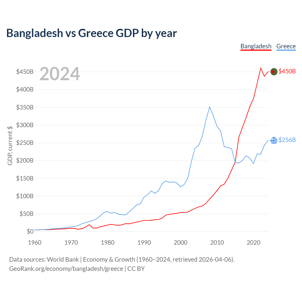 Bangladesh has a GDP of $450B compared to $256B for Greece, ranking 36/197 and 53/197 by economy size, respectively.