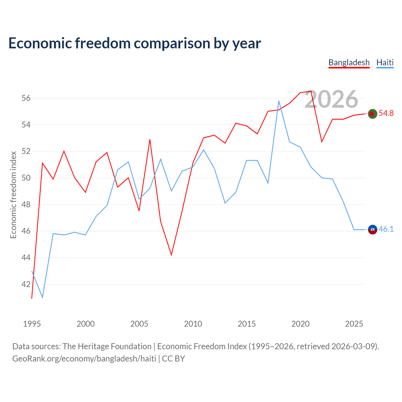 The Economic Freedom Index for Bangladesh is 54.8, ranking 131/197, compared to 46.1 for Haiti, ranking 178/197. The chart above displays a comparison of annual changes in economic freedom indexes.