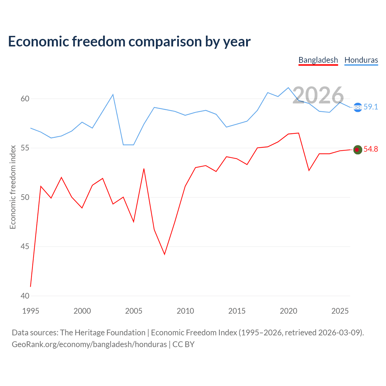 The Economic Freedom Index for Bangladesh is 54.8, ranking 131/197, compared to 59.1 for Honduras, ranking 105/197. The chart above displays a comparison of annual changes in economic freedom indexes.