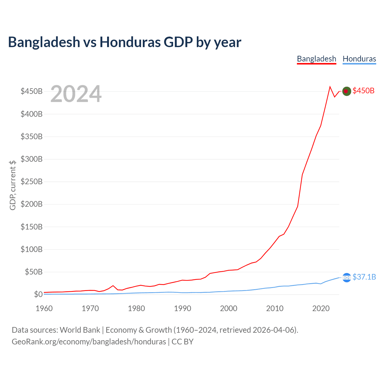 Bangladesh has a GDP of $450B compared to $37.1B for Honduras, ranking 36/197 and 104/197 by economy size, respectively.