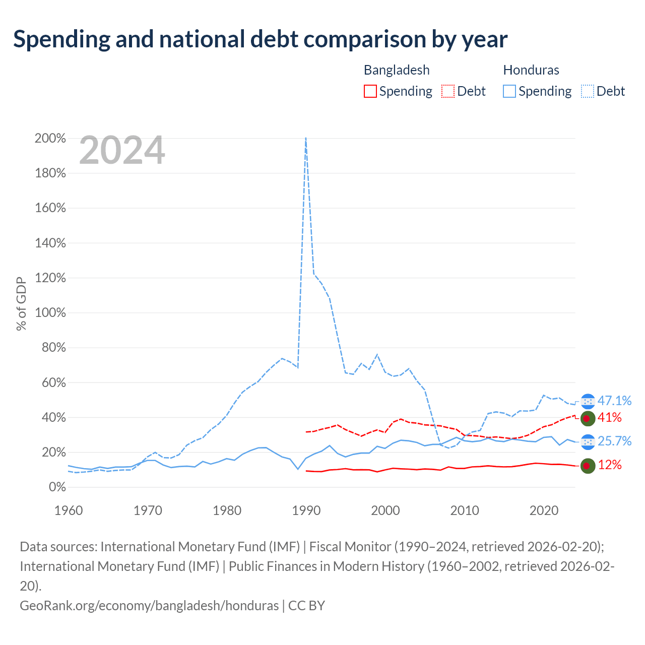 Bangladesh has $184B in government debt (41% of GDP), compared to $17.5B (47.1% of GDP) in Honduras.