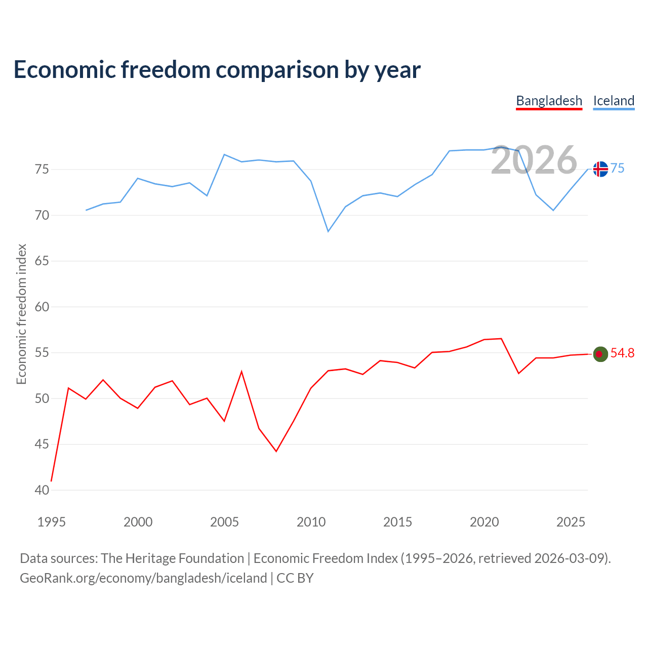 The Economic Freedom Index for Bangladesh is 54.8, ranking 131/197, compared to 75 for Iceland, ranking 19/197. The chart above displays a comparison of annual changes in economic freedom indexes.