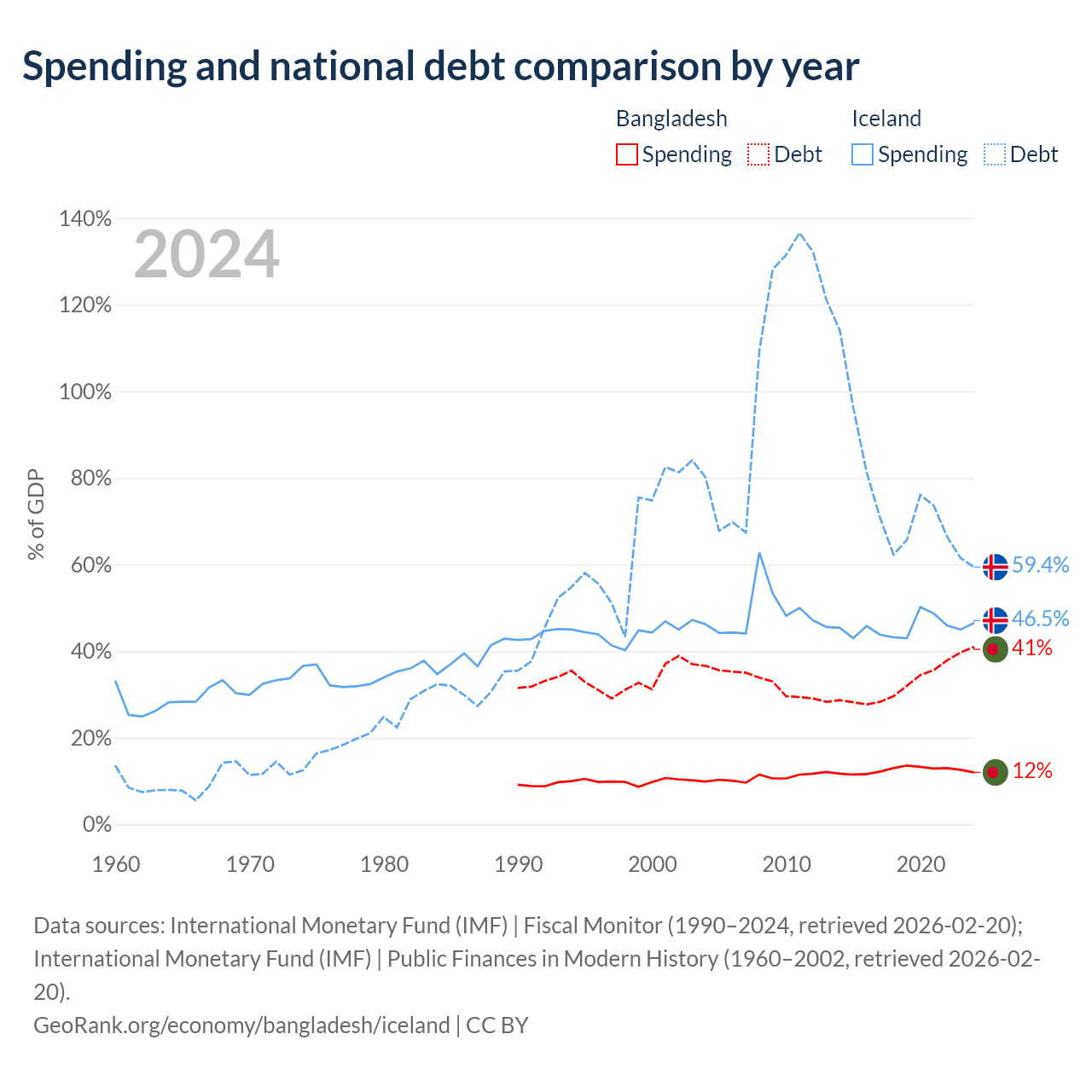 Bangladesh has $184B in government debt (41% of GDP), compared to $19.8B (59.4% of GDP) in Iceland.