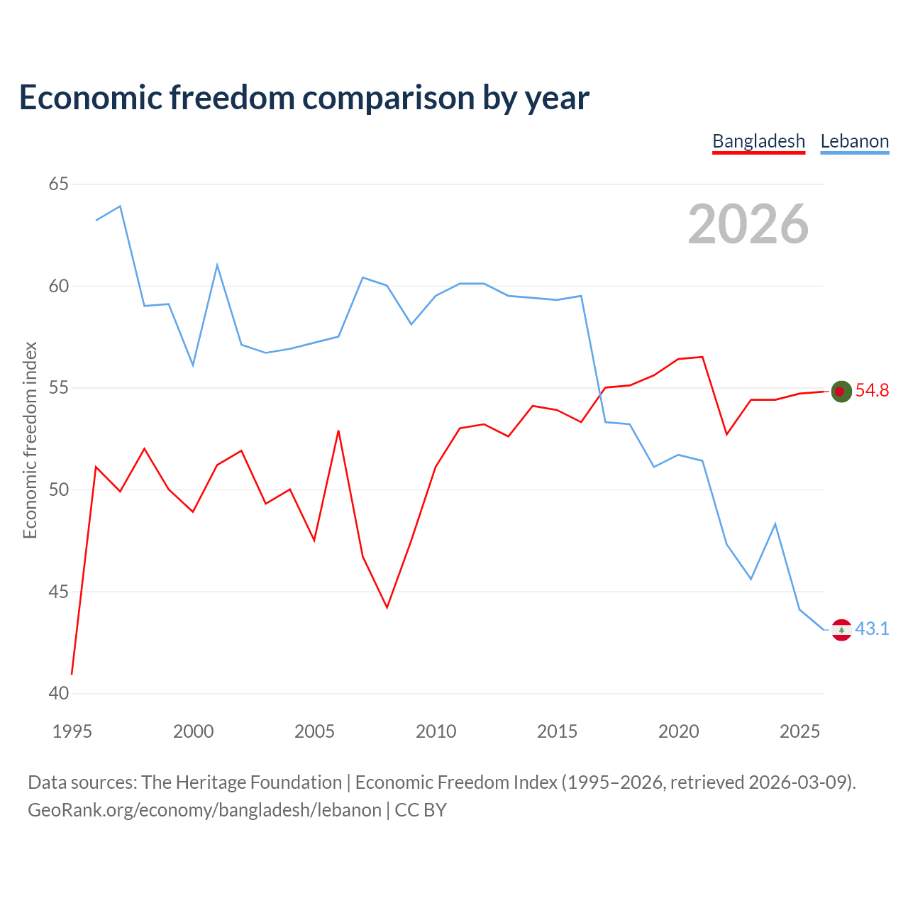 The Economic Freedom Index for Bangladesh is 54.8, ranking 131/197, compared to 43.1 for Lebanon, ranking 183/197. The chart above displays a comparison of annual changes in economic freedom indexes.