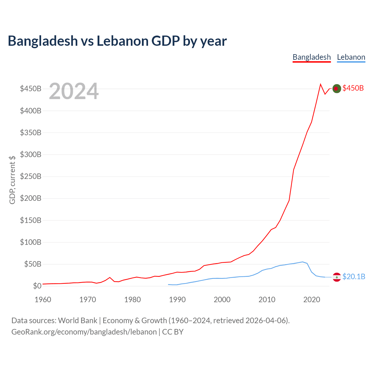 Bangladesh has a GDP of $450B compared to $20.1B for Lebanon, ranking 36/197 and 128/197 by economy size, respectively.