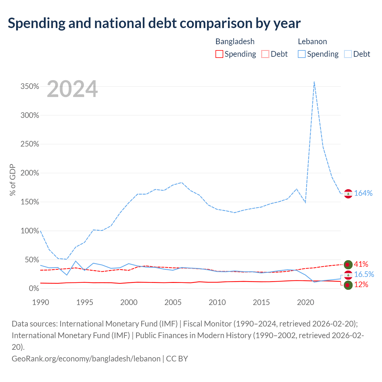 Bangladesh has $184B in government debt (41% of GDP), compared to $38.7B (163.8% of GDP) in Lebanon.