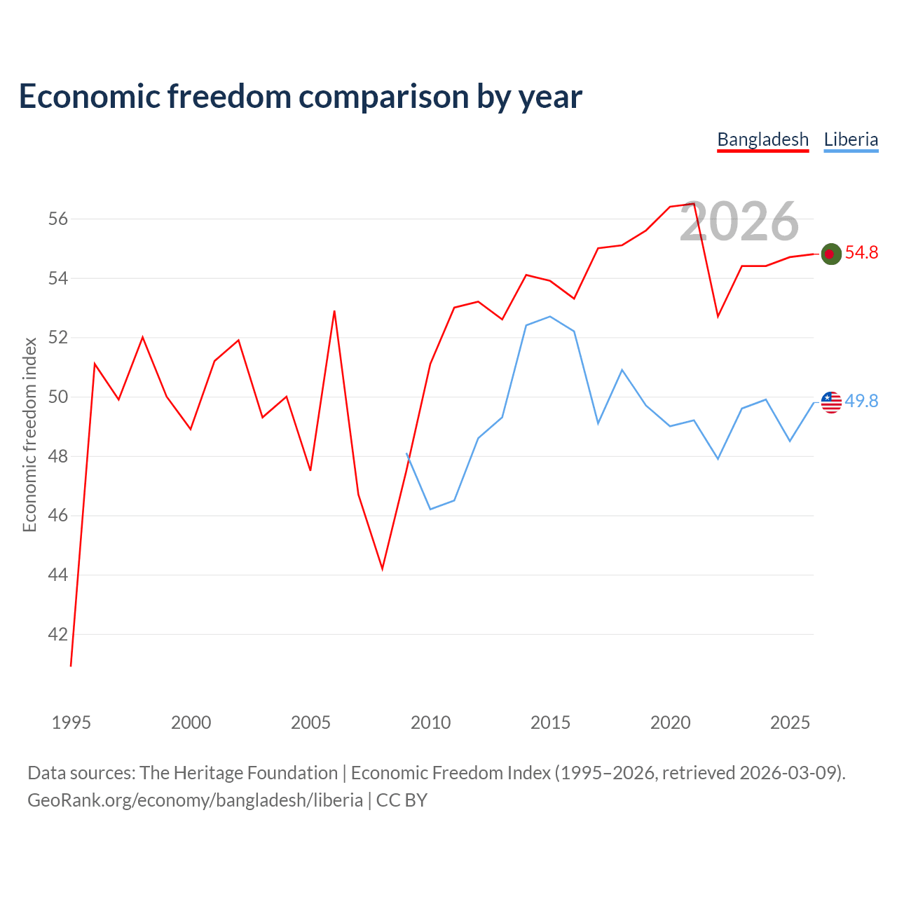 The Economic Freedom Index for Bangladesh is 54.8, ranking 131/197, compared to 49.8 for Liberia, ranking 163/197. The chart above displays a comparison of annual changes in economic freedom indexes.