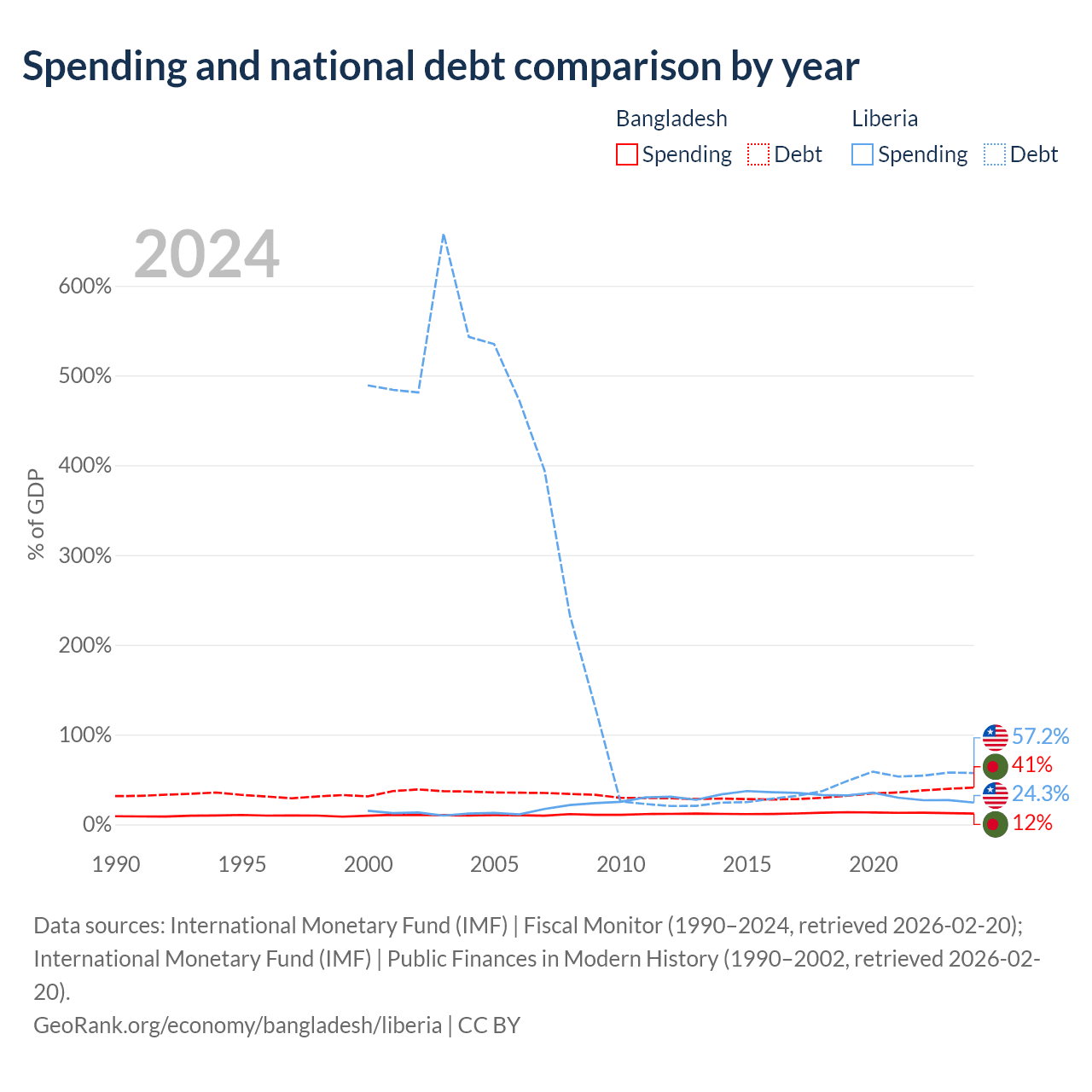 Bangladesh has $184B in government debt (41% of GDP), compared to $2.73B (57.2% of GDP) in Liberia.