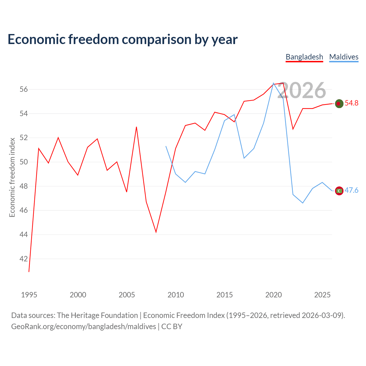 The Economic Freedom Index for Bangladesh is 54.8, ranking 131/197, compared to 47.6 for Maldives, ranking 174/197. The chart above displays a comparison of annual changes in economic freedom indexes.
