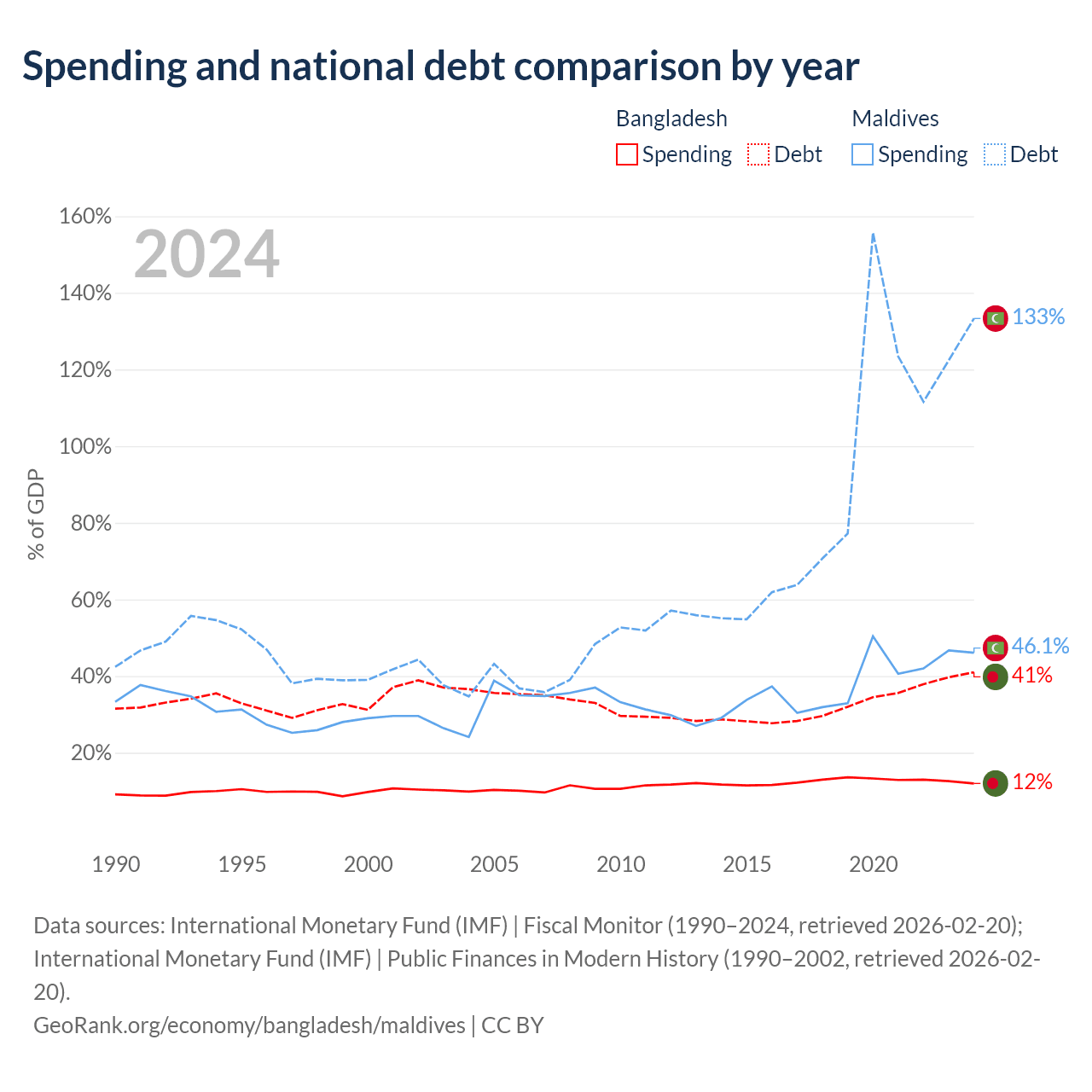 Bangladesh has $184B in government debt (41% of GDP), compared to $9.41B (133.3% of GDP) in Maldives.