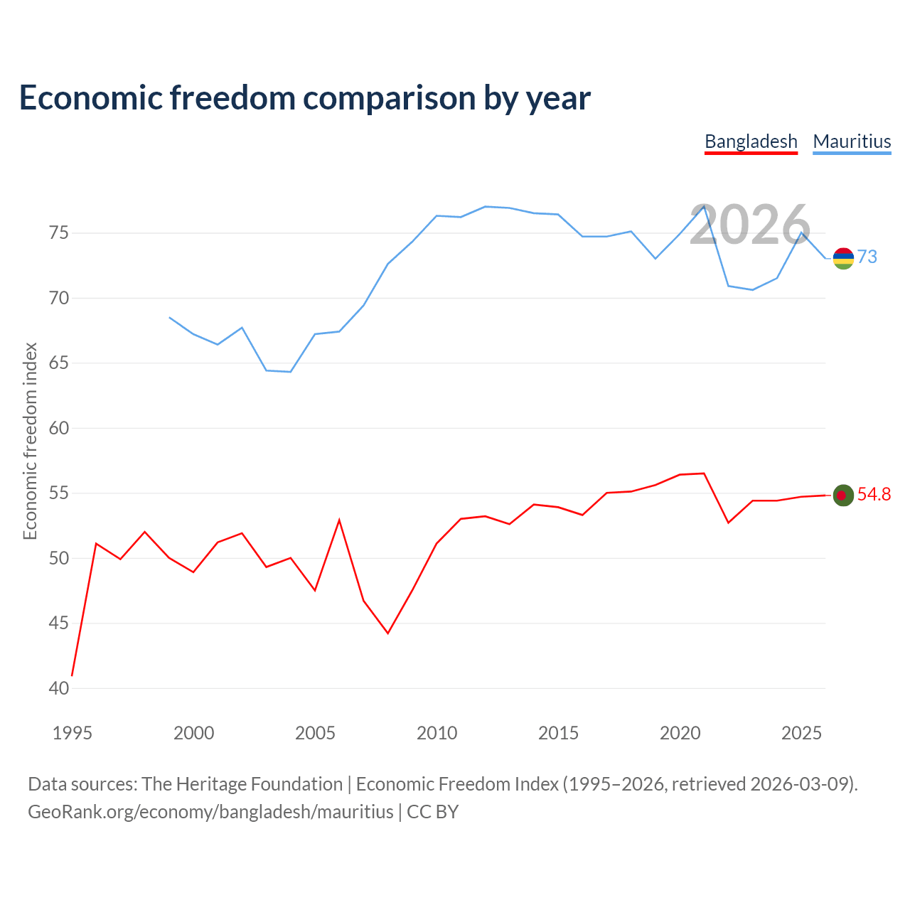 The Economic Freedom Index for Bangladesh is 54.8, ranking 131/197, compared to 73 for Mauritius, ranking 26/197. The chart above displays a comparison of annual changes in economic freedom indexes.
