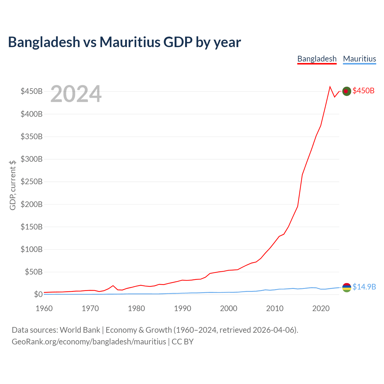 Bangladesh has a GDP of $450B compared to $14.9B for Mauritius, ranking 36/197 and 143/197 by economy size, respectively.