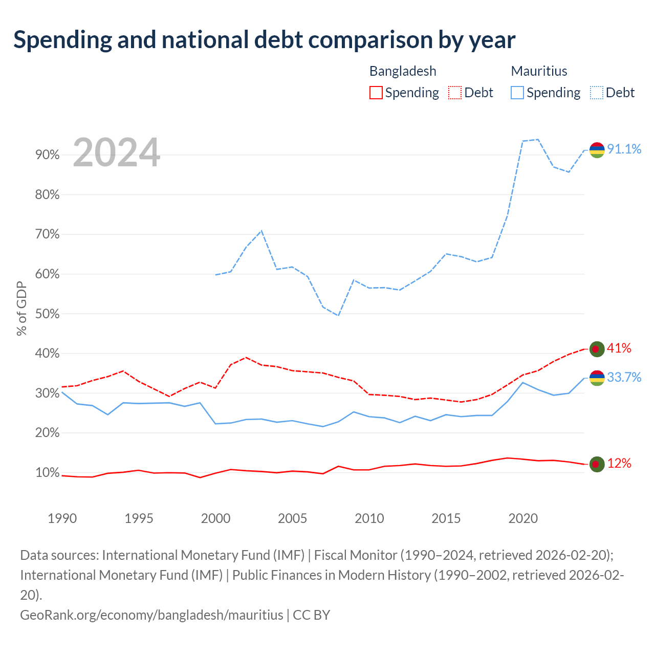 Bangladesh has $184B in government debt (41% of GDP), compared to $13.6B (91.1% of GDP) in Mauritius.