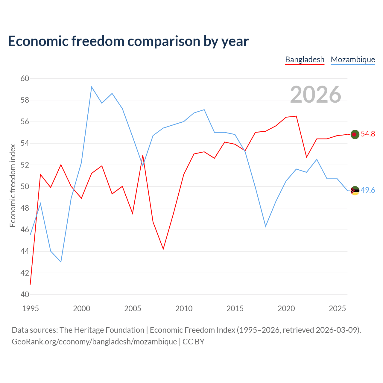 The Economic Freedom Index for Bangladesh is 54.8, ranking 131/197, compared to 49.6 for Mozambique, ranking 164/197. The chart above displays a comparison of annual changes in economic freedom indexes.