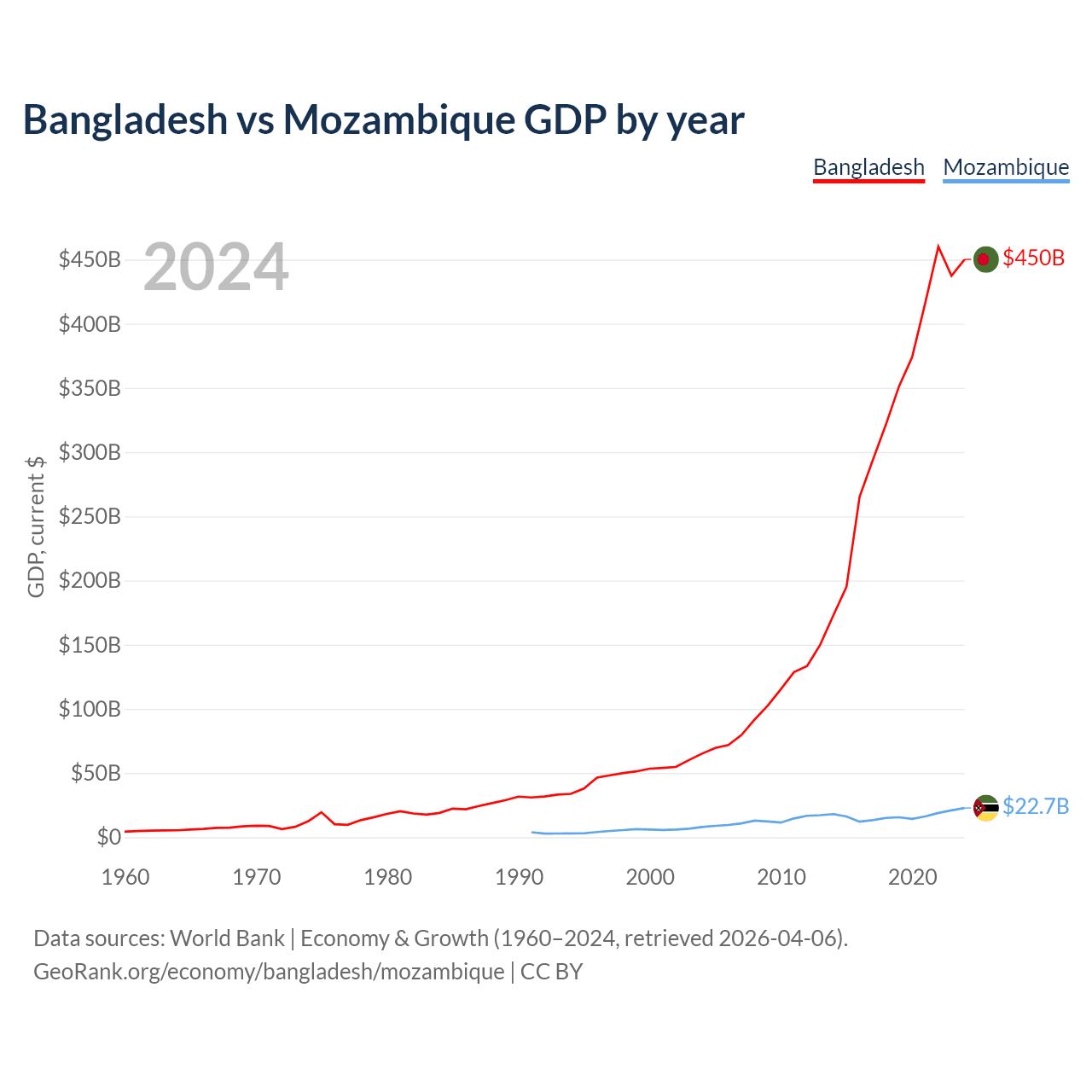 Bangladesh has a GDP of $450B compared to $22.7B for Mozambique, ranking 36/197 and 123/197 by economy size, respectively.