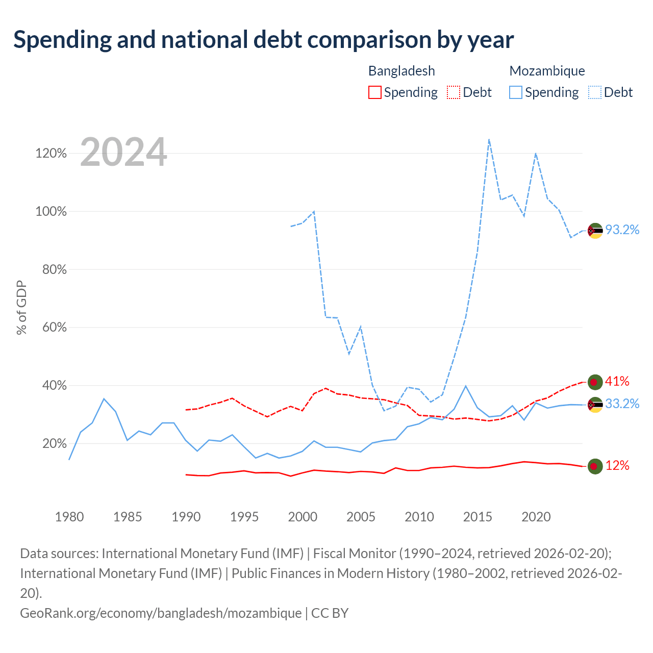 Bangladesh has $184B in government debt (41% of GDP), compared to $21.2B (93.2% of GDP) in Mozambique.