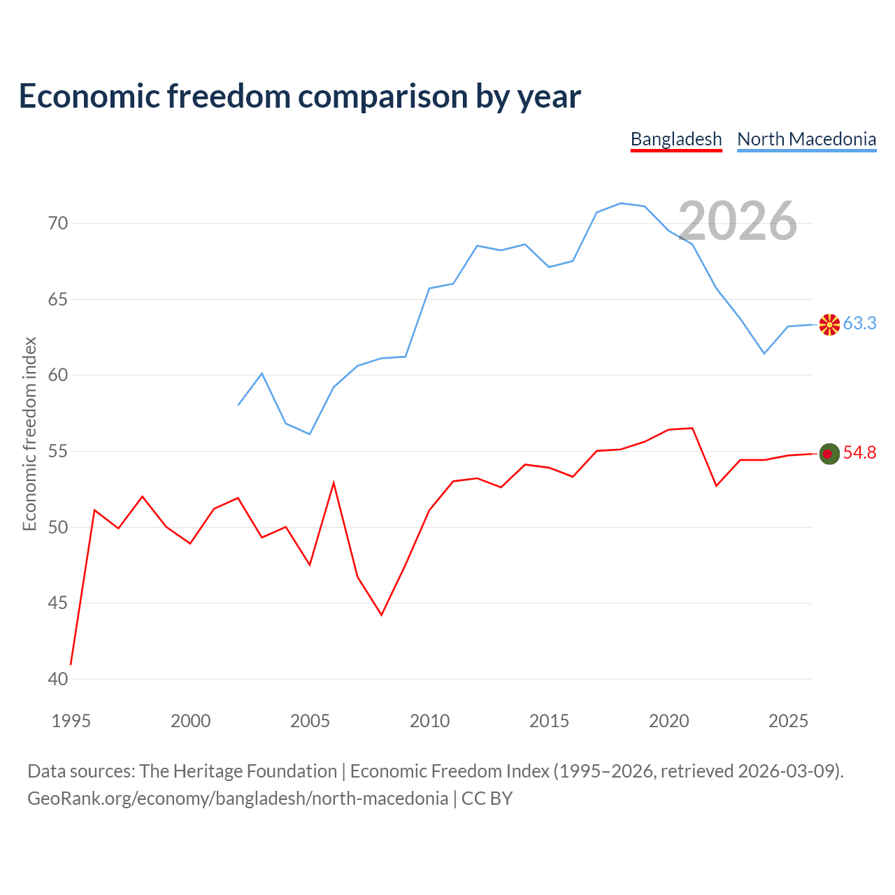 Data sources: The Heritage Foundation | Economic Freedom Index (1995–2026, retrieved 2026-03-09).