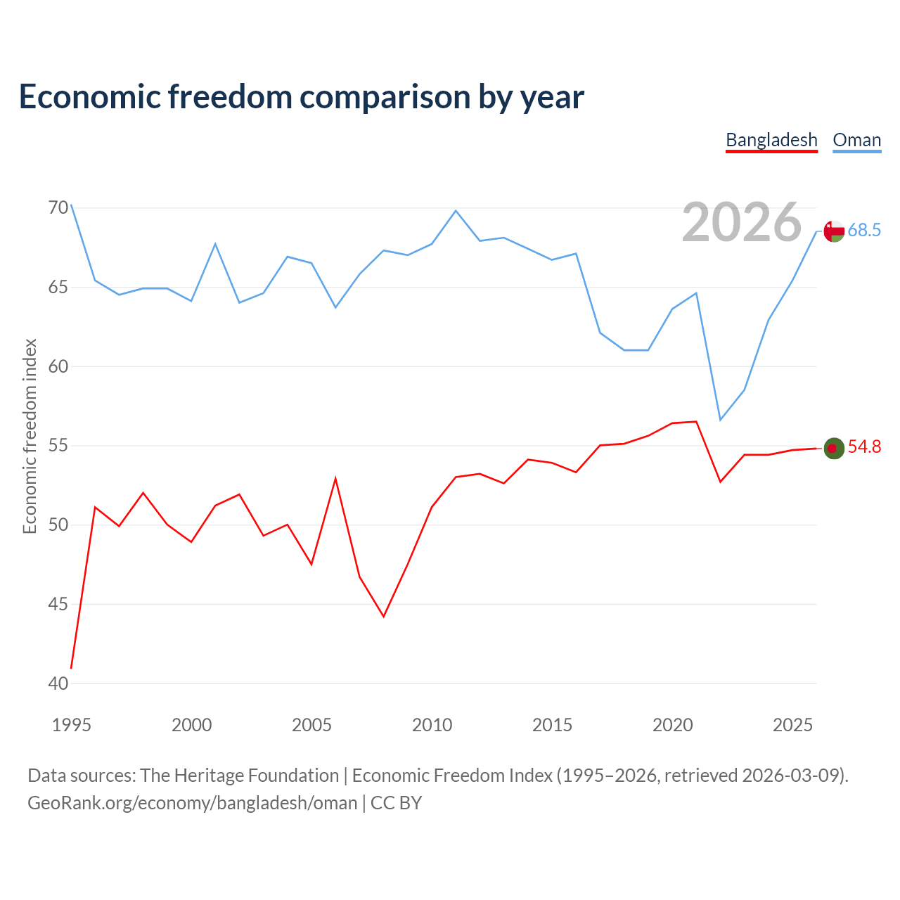 The Economic Freedom Index for Bangladesh is 54.8, ranking 131/197, compared to 68.5 for Oman, ranking 45/197. The chart above displays a comparison of annual changes in economic freedom indexes.