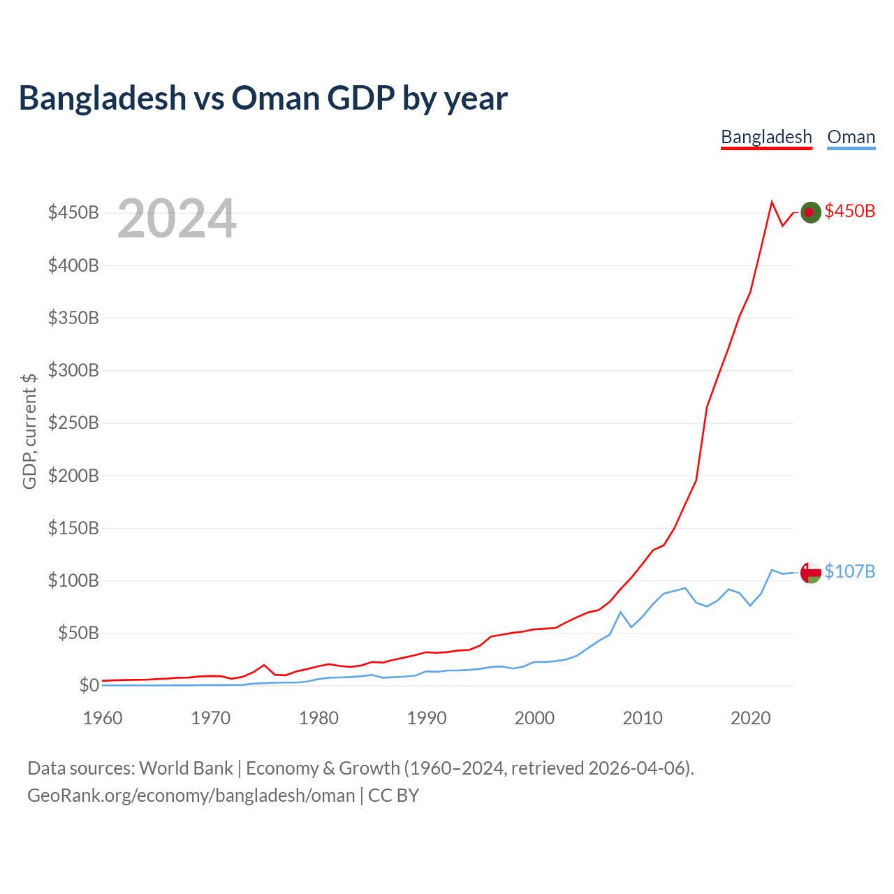 Bangladesh has a GDP of $450B compared to $107B for Oman, ranking 36/197 and 70/197 by economy size, respectively.