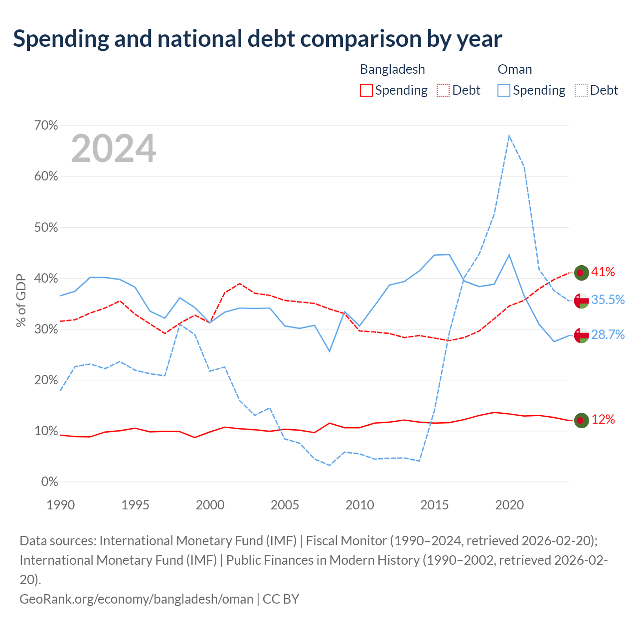 Bangladesh has $184B in government debt (41% of GDP), compared to $38B (35.5% of GDP) in Oman.