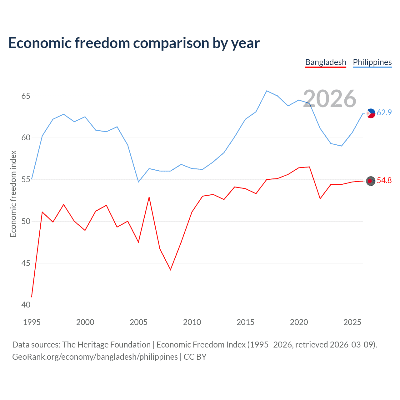 Data sources: The Heritage Foundation | Economic Freedom Index (1995–2026, retrieved 2026-03-09).