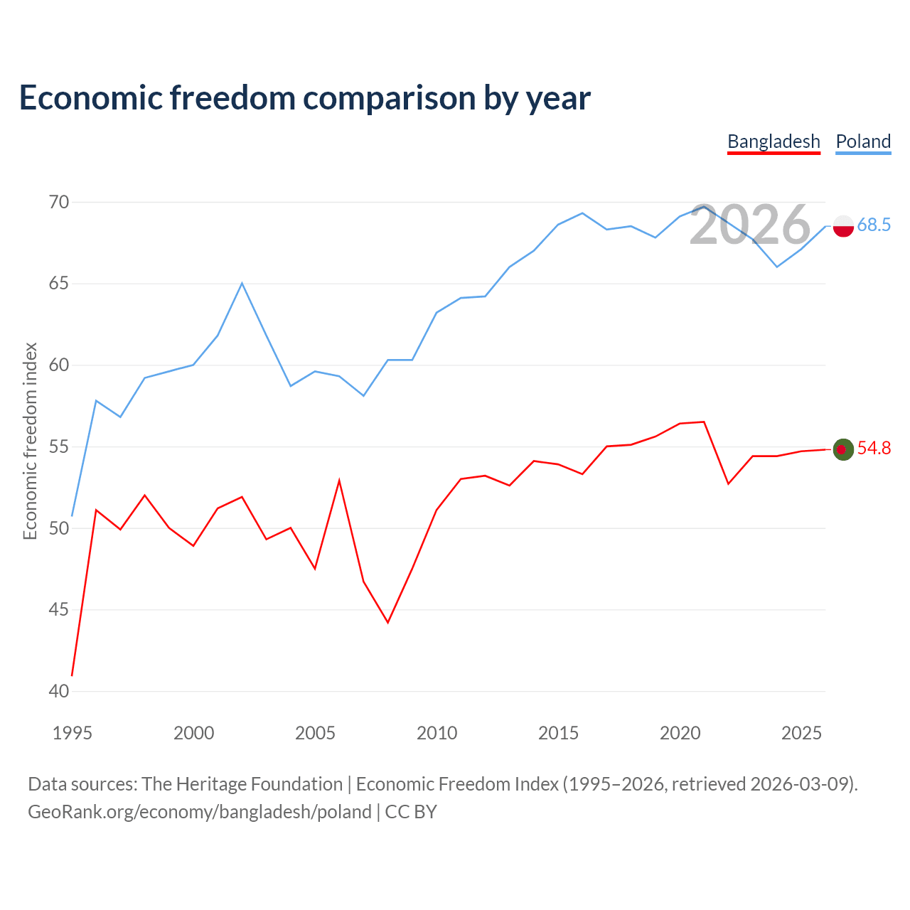 The Economic Freedom Index for Bangladesh is 54.8, ranking 131/197, compared to 68.5 for Poland, ranking 46/197. The chart above displays a comparison of annual changes in economic freedom indexes.