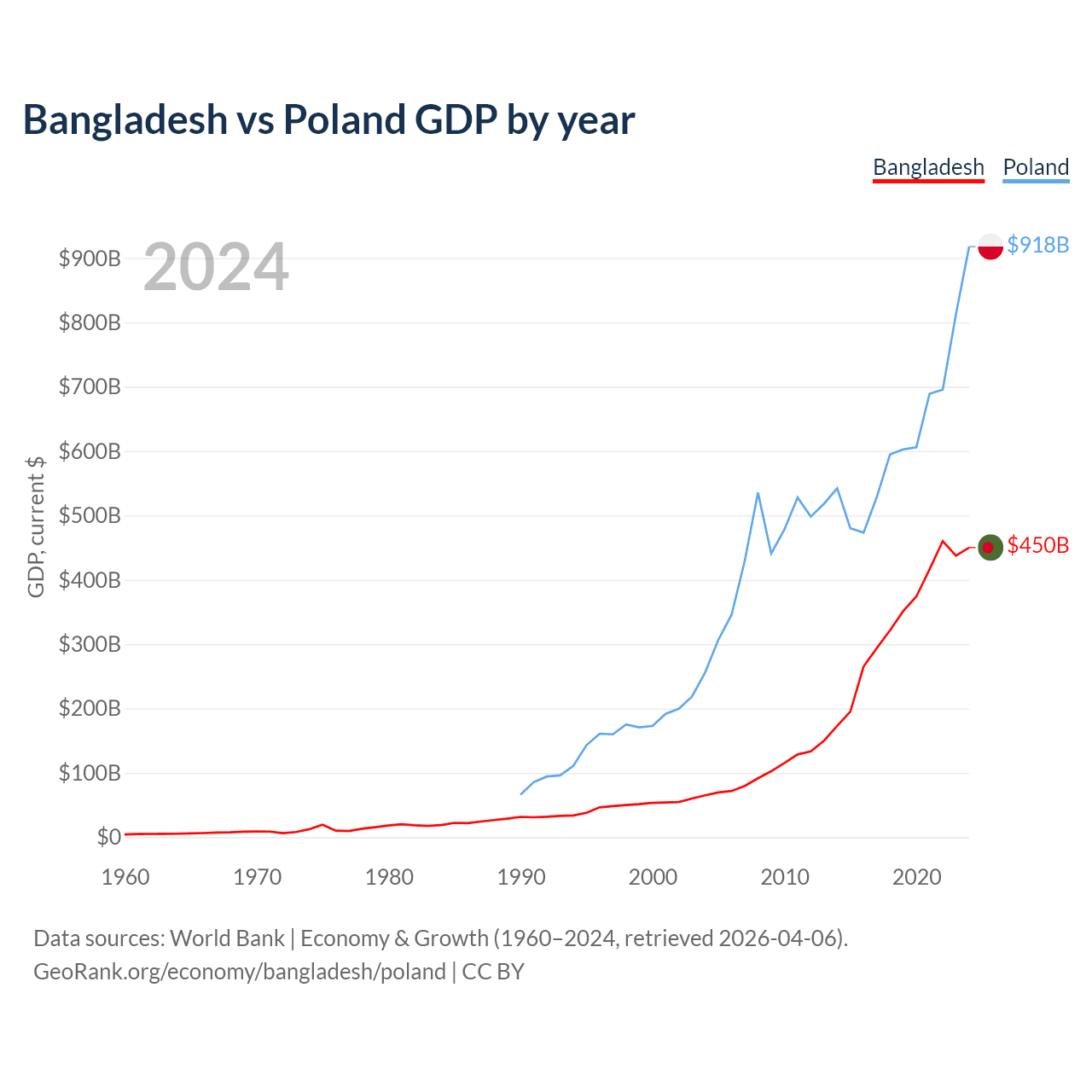 Bangladesh has a GDP of $450B compared to $918B for Poland, ranking 36/197 and 21/197 by economy size, respectively.