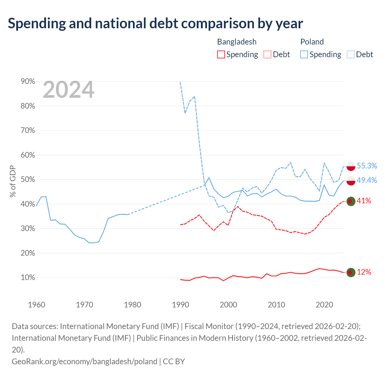 Bangladesh has $184B in government debt (41% of GDP), compared to $507B (55.3% of GDP) in Poland.