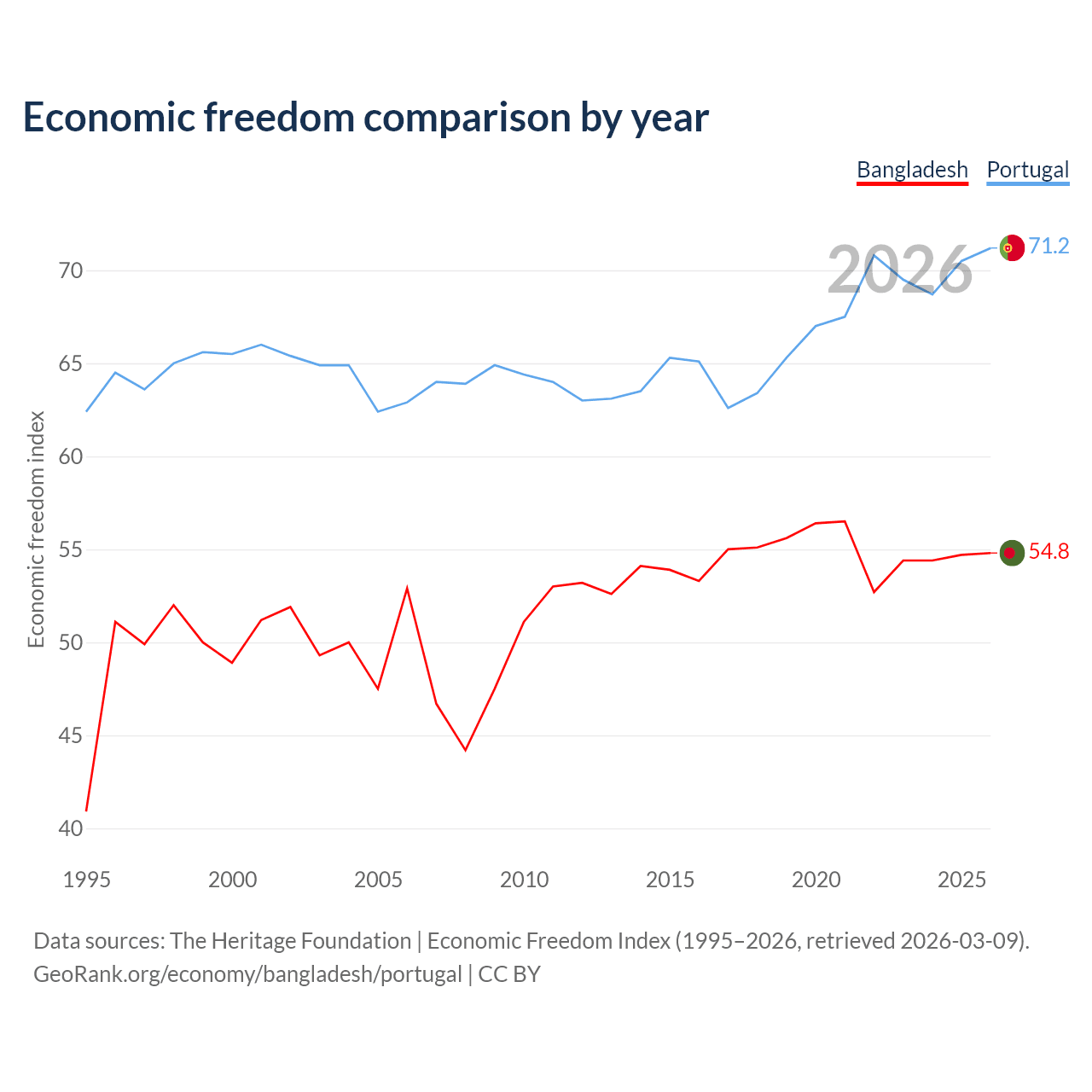 The Economic Freedom Index for Bangladesh is 54.8, ranking 131/197, compared to 71.2 for Portugal, ranking 33/197. The chart above displays a comparison of annual changes in economic freedom indexes.