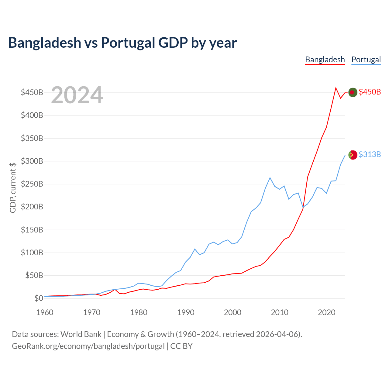 Bangladesh has a GDP of $450B compared to $313B for Portugal, ranking 36/197 and 46/197 by economy size, respectively.