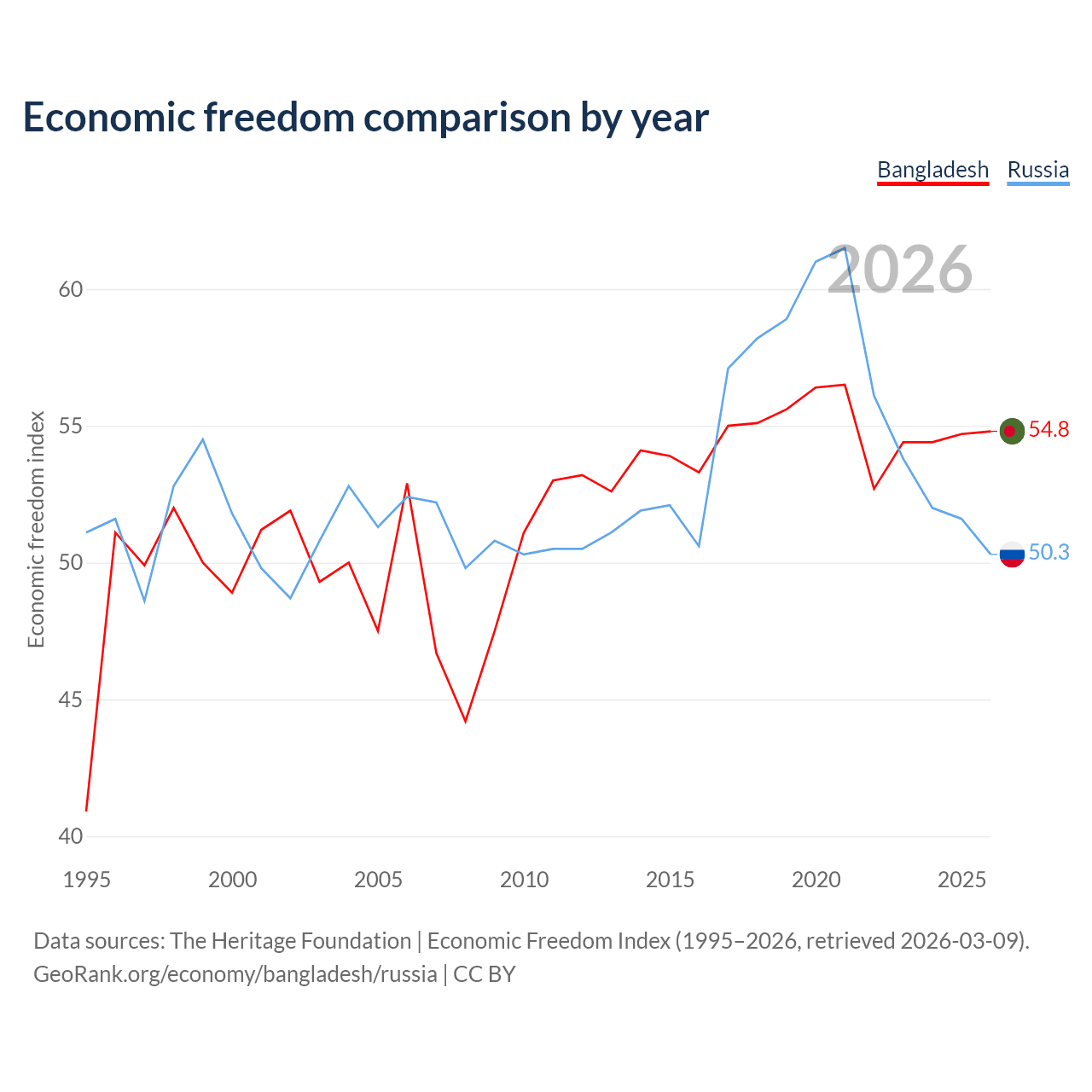 The Economic Freedom Index for Bangladesh is 54.8, ranking 131/197, compared to 50.3 for Russia, ranking 161/197. The chart above displays a comparison of annual changes in economic freedom indexes.