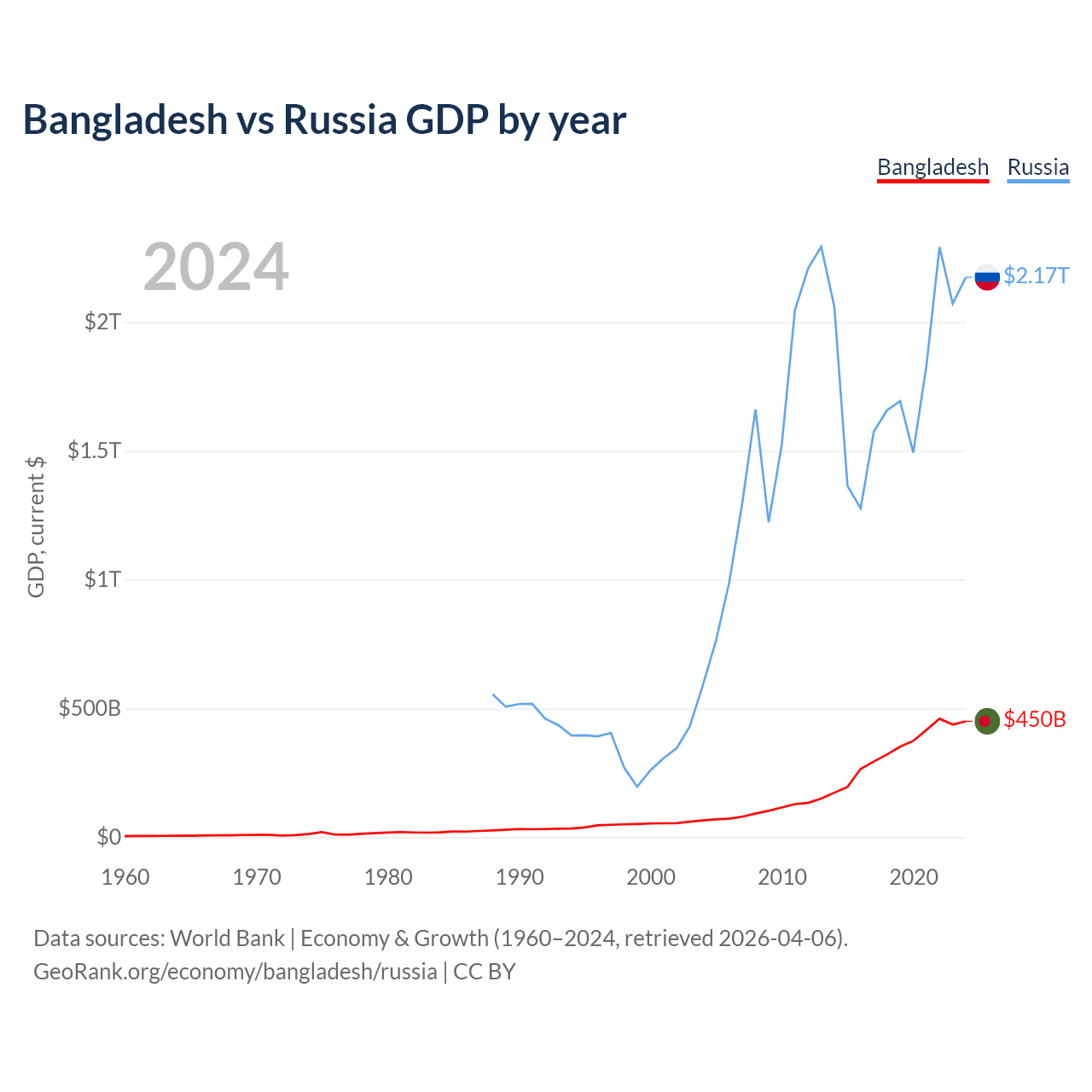 Bangladesh has a GDP of $450B compared to $2.17T for Russia, ranking 36/197 and 11/197 by economy size, respectively.