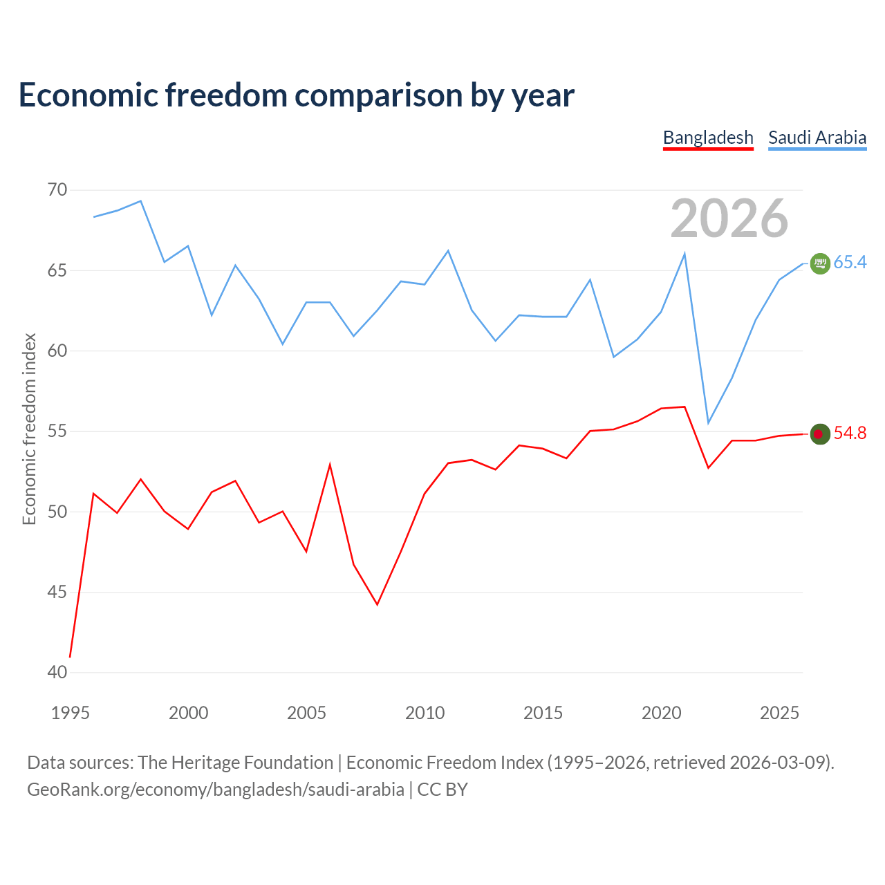 The Economic Freedom Index for Bangladesh is 54.8, ranking 131/197, compared to 65.4 for Saudi Arabia, ranking 65/197. The chart above displays a comparison of annual changes in economic freedom indexes.