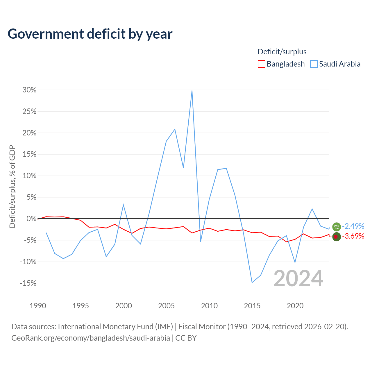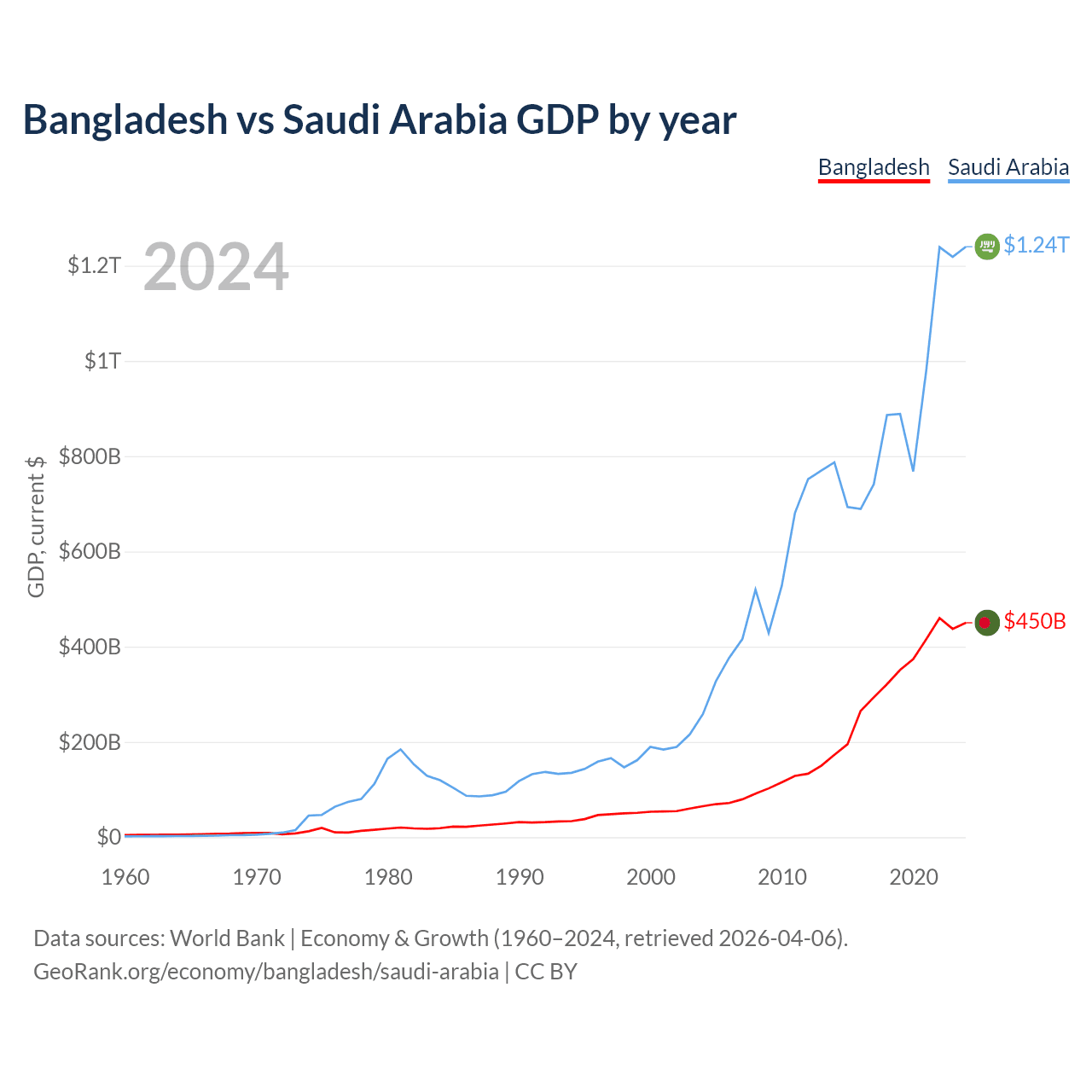 Bangladesh has a GDP of $450B compared to $1.24T for Saudi Arabia, ranking 36/197 and 18/197 by economy size, respectively.