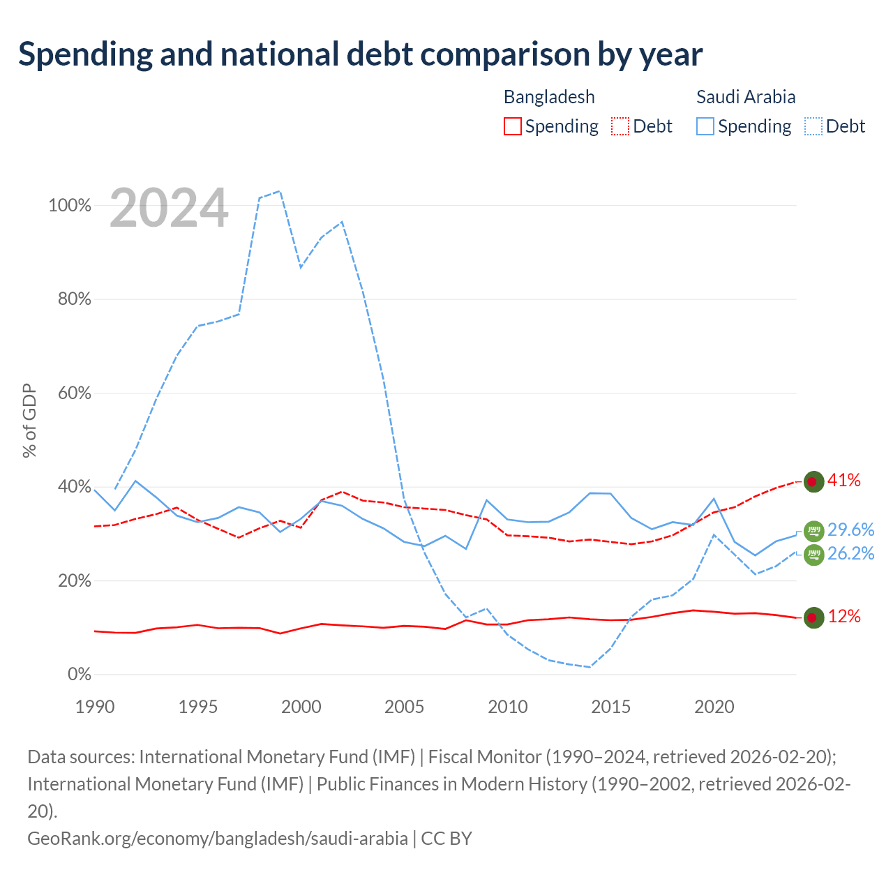 Bangladesh has $184B in government debt (41% of GDP), compared to $324B (26.2% of GDP) in Saudi Arabia.