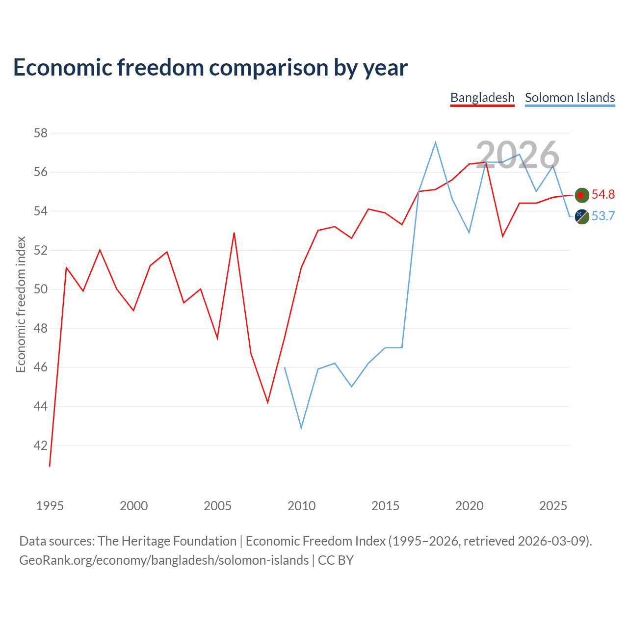 The Economic Freedom Index for Bangladesh is 54.8, ranking 131/197, compared to 53.7 for the Solomon Islands, ranking 137/197. The chart above displays a comparison of annual changes in economic freedom indexes.