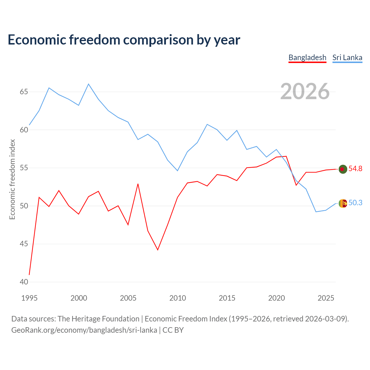 The Economic Freedom Index for Bangladesh is 54.8, ranking 131/197, compared to 50.3 for Sri Lanka, ranking 162/197. The chart above displays a comparison of annual changes in economic freedom indexes.