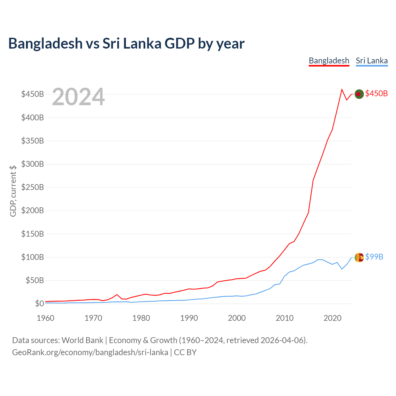 Bangladesh has a GDP of $450B compared to $99B for Sri Lanka, ranking 36/197 and 72/197 by economy size, respectively.
