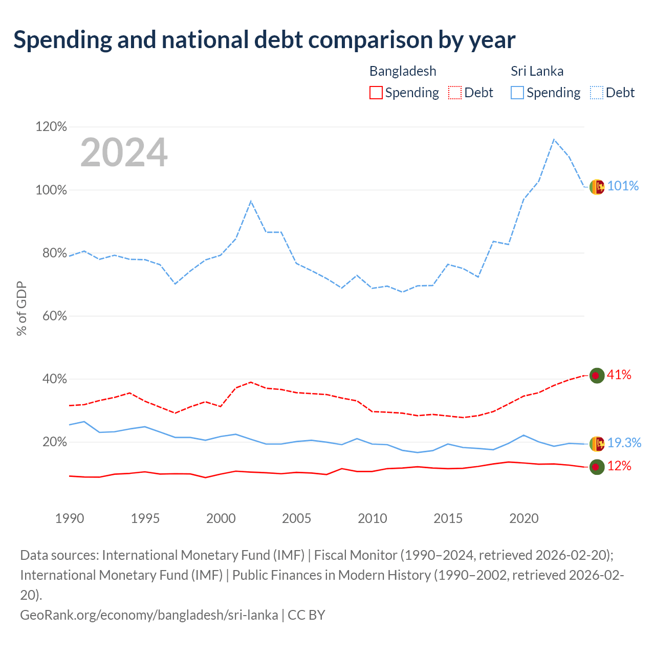 Bangladesh has $184B in government debt (41% of GDP), compared to $99.8B (100.8% of GDP) in Sri Lanka.