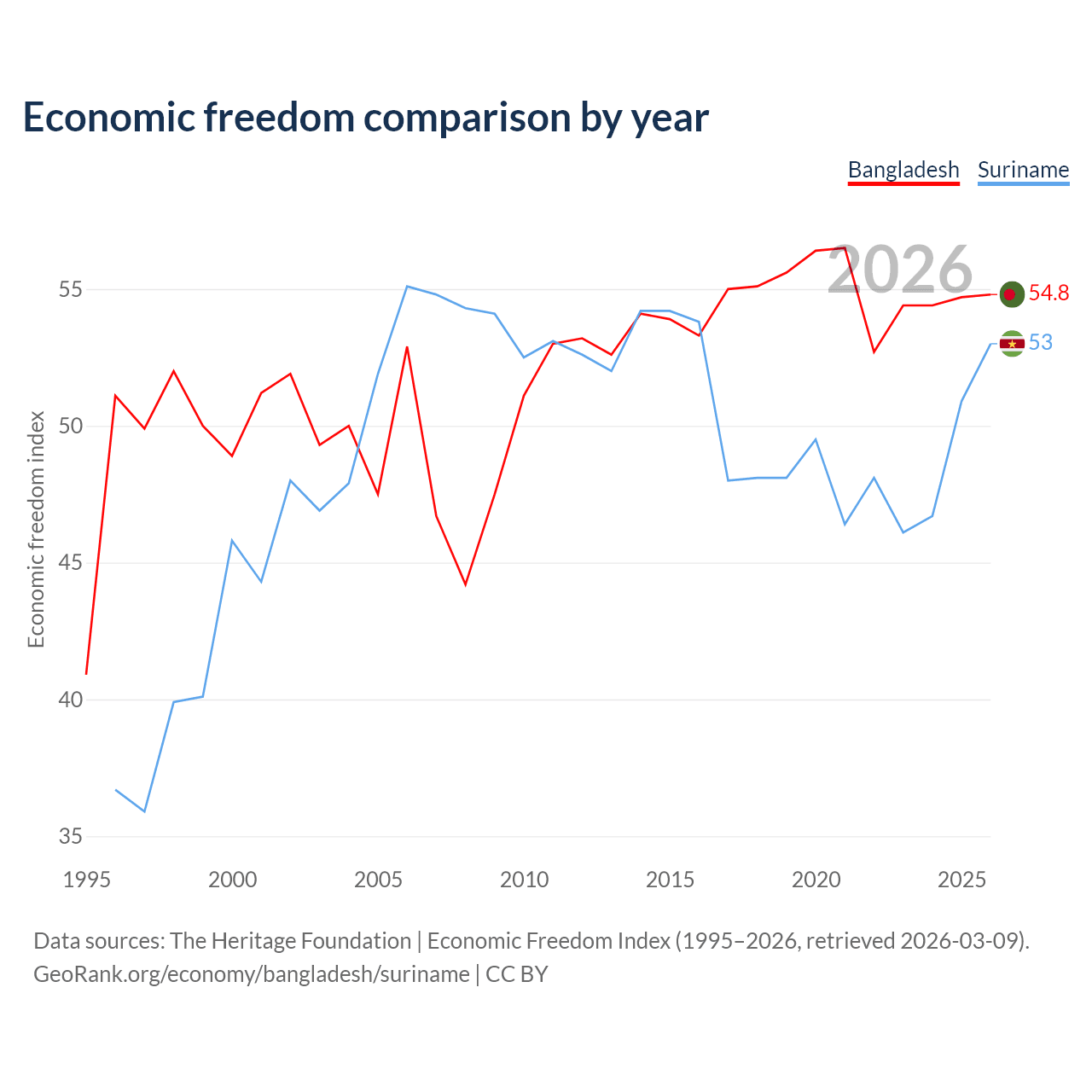 The Economic Freedom Index for Bangladesh is 54.8, ranking 131/197, compared to 53 for Suriname, ranking 143/197. The chart above displays a comparison of annual changes in economic freedom indexes.