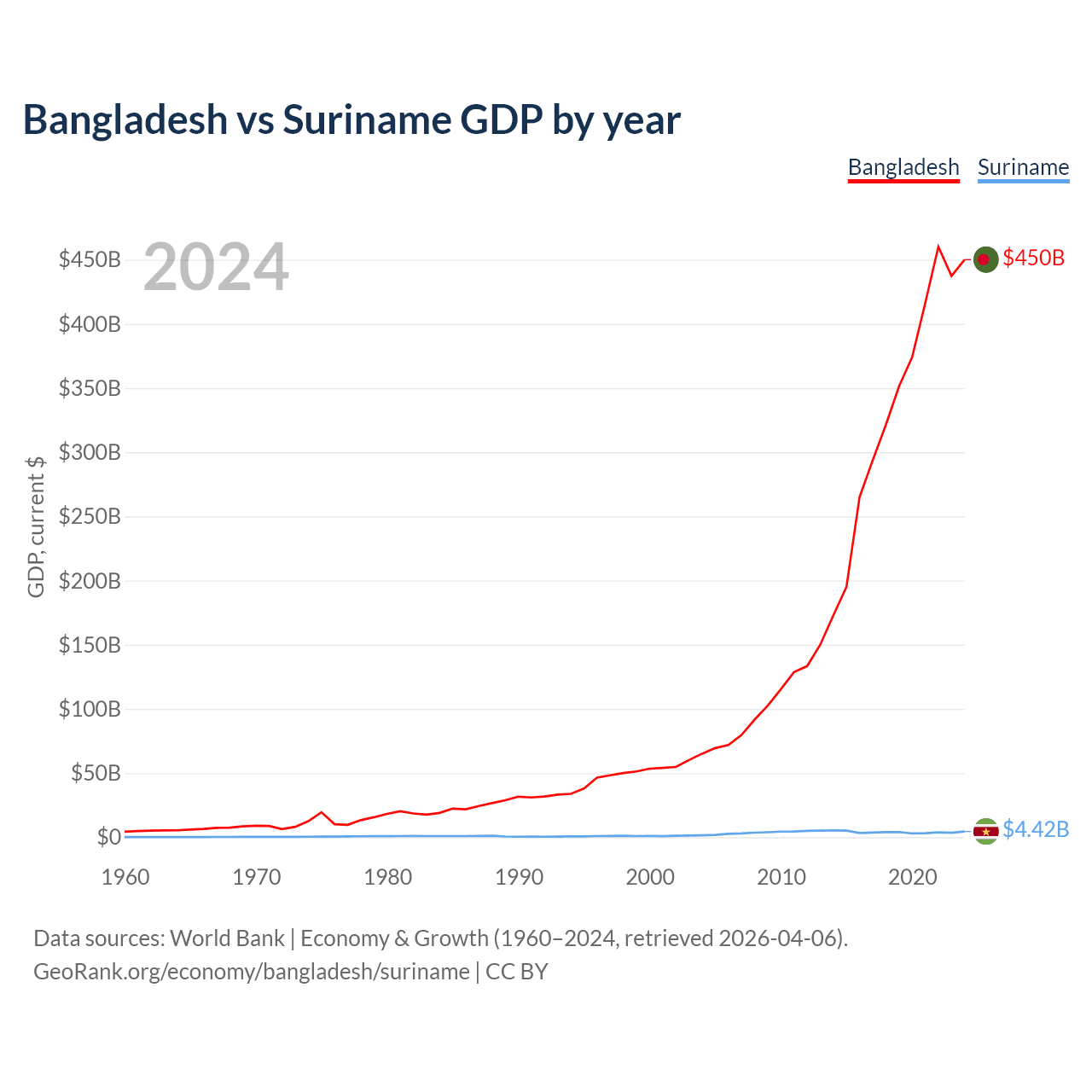 Bangladesh has a GDP of $450B compared to $4.42B for Suriname, ranking 36/197 and 164/197 by economy size, respectively.