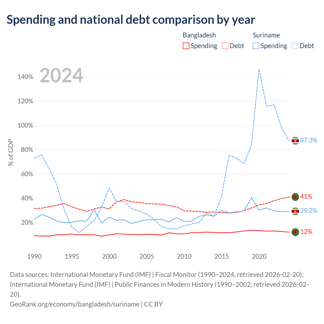 Bangladesh has $184B in government debt (41% of GDP), compared to $3.86B (87.3% of GDP) in Suriname.