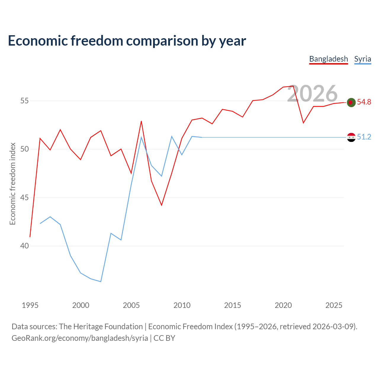The Economic Freedom Index for Bangladesh is 54.8, ranking 131/197, compared to 51.2 for Syria, ranking 155/197. The chart above displays a comparison of annual changes in economic freedom indexes.