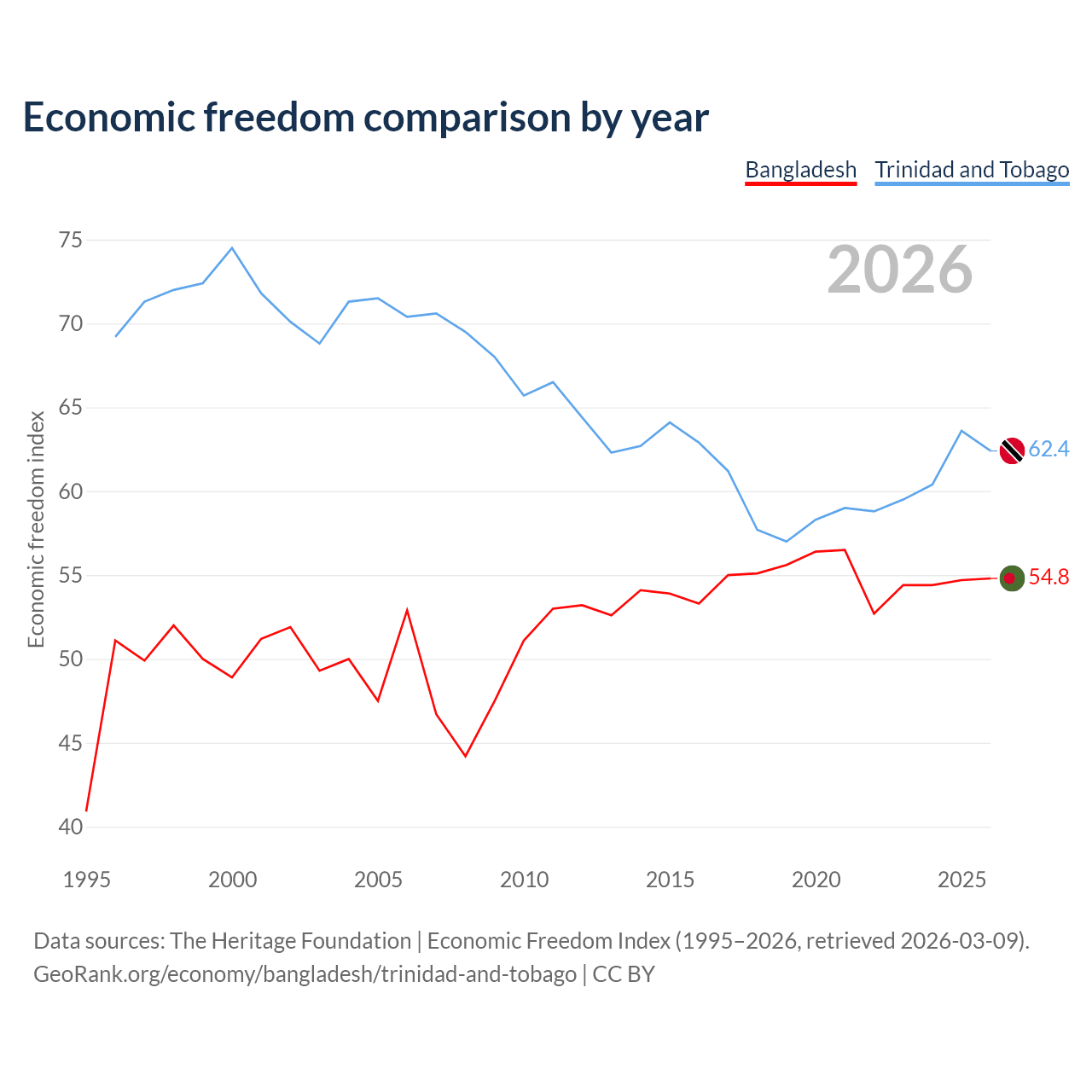 The Economic Freedom Index for Bangladesh is 54.8, ranking 131/197, compared to 62.4 for Trinidad and Tobago, ranking 87/197. The chart above displays a comparison of annual changes in economic freedom indexes.