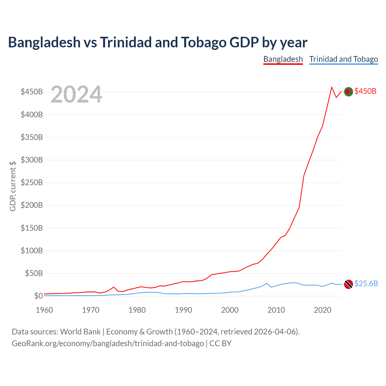 Bangladesh has a GDP of $450B compared to $25.6B for Trinidad and Tobago, ranking 36/197 and 115/197 by economy size, respectively.
